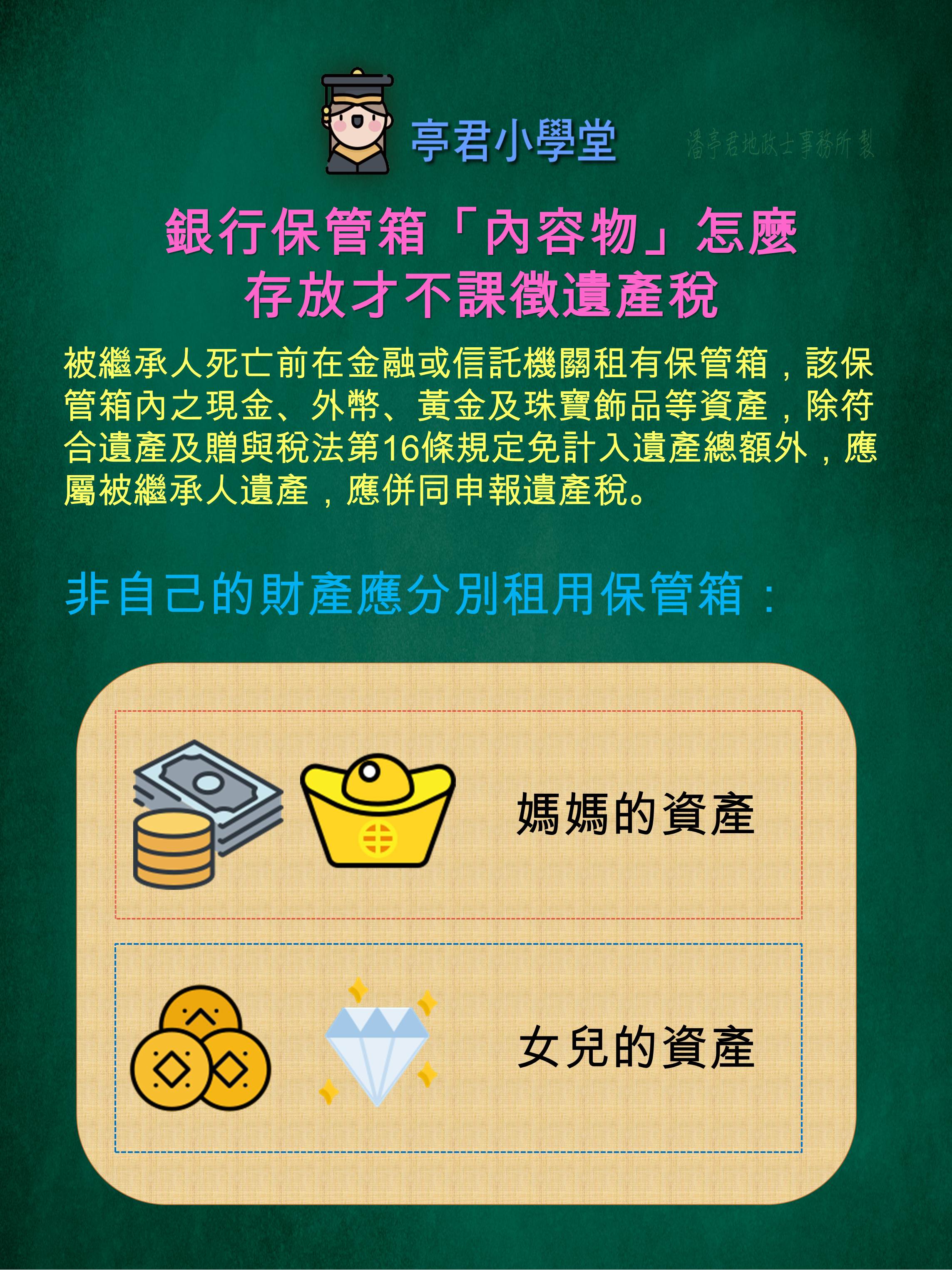 許多人有租用銀行保管箱的習慣,一來安全防盜,二來私密空間避免干擾。裡面存放的珠寶首飾、黃金、外幣,可能是太太的嫁妝、兒女們的彌月金飾或是長輩們寄放珠寶黃金,但是當保管箱承租人往生時,上述的貴重物品都會被國稅局記載在「保管箱財產清冊」當中,做為課徵遺產稅的依據,所以是否依照個人名義承租保管箱,而非全家只租一個共同保管,成為節稅的重要問題。